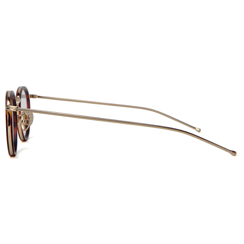 Manufacturing technic of eyewear around 50s to 60s is low and bridge parts are fastened by four points to make durability. New metal model used this structure and succeeded to make classic design. High purity titanium frame make good durability and comfortable feeling. SEAN has stylish lens shape and will produce intellect atmosphere.